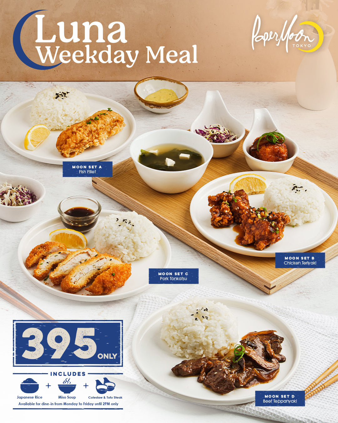 Savor the Luna Weekday Meal – your choice of Fish Fillet, Chicken Teriyaki, Pork Tonkatsu, or Beef Teppanyaki, served with Japanese rice, miso soup, coleslaw, and tofu steak. All for 395 only.