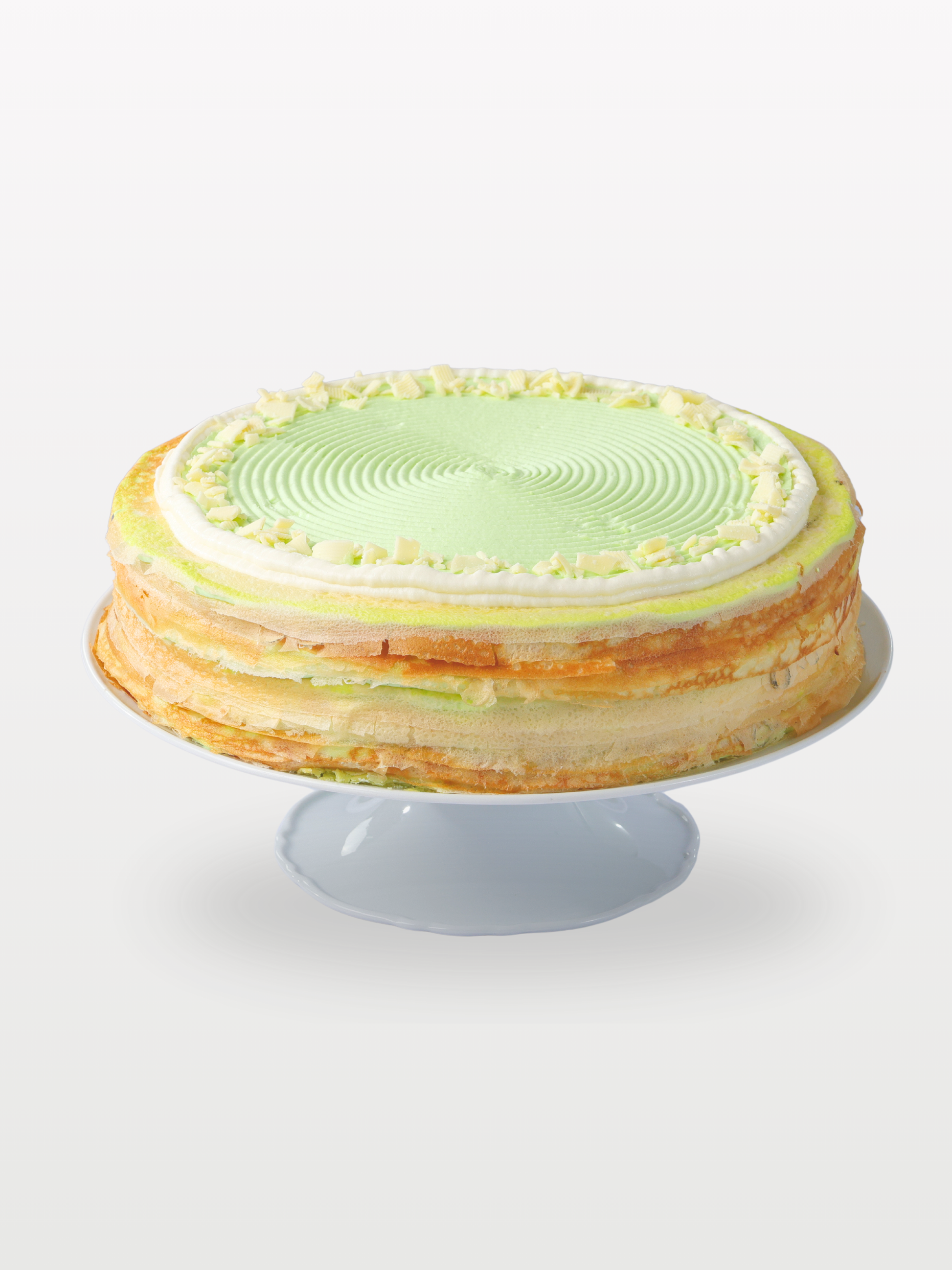 Delicate, handcrafted mille crepe layered with real coconut bits and silky pandan cream. Finished with a light pandan swirl and white chocolate shavings—light, balanced, and crafted with quiet elegance.